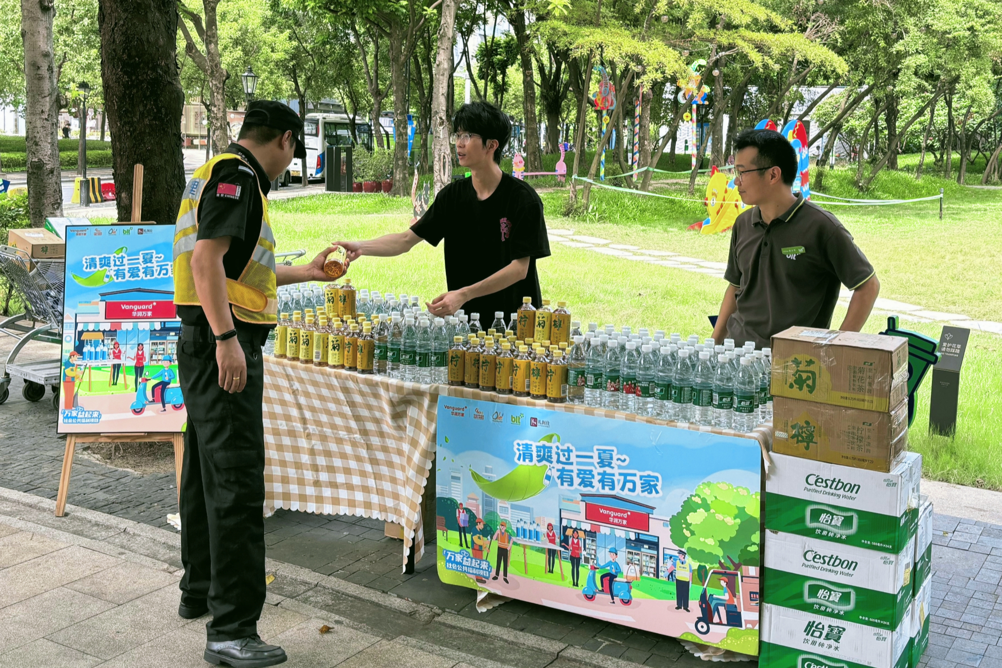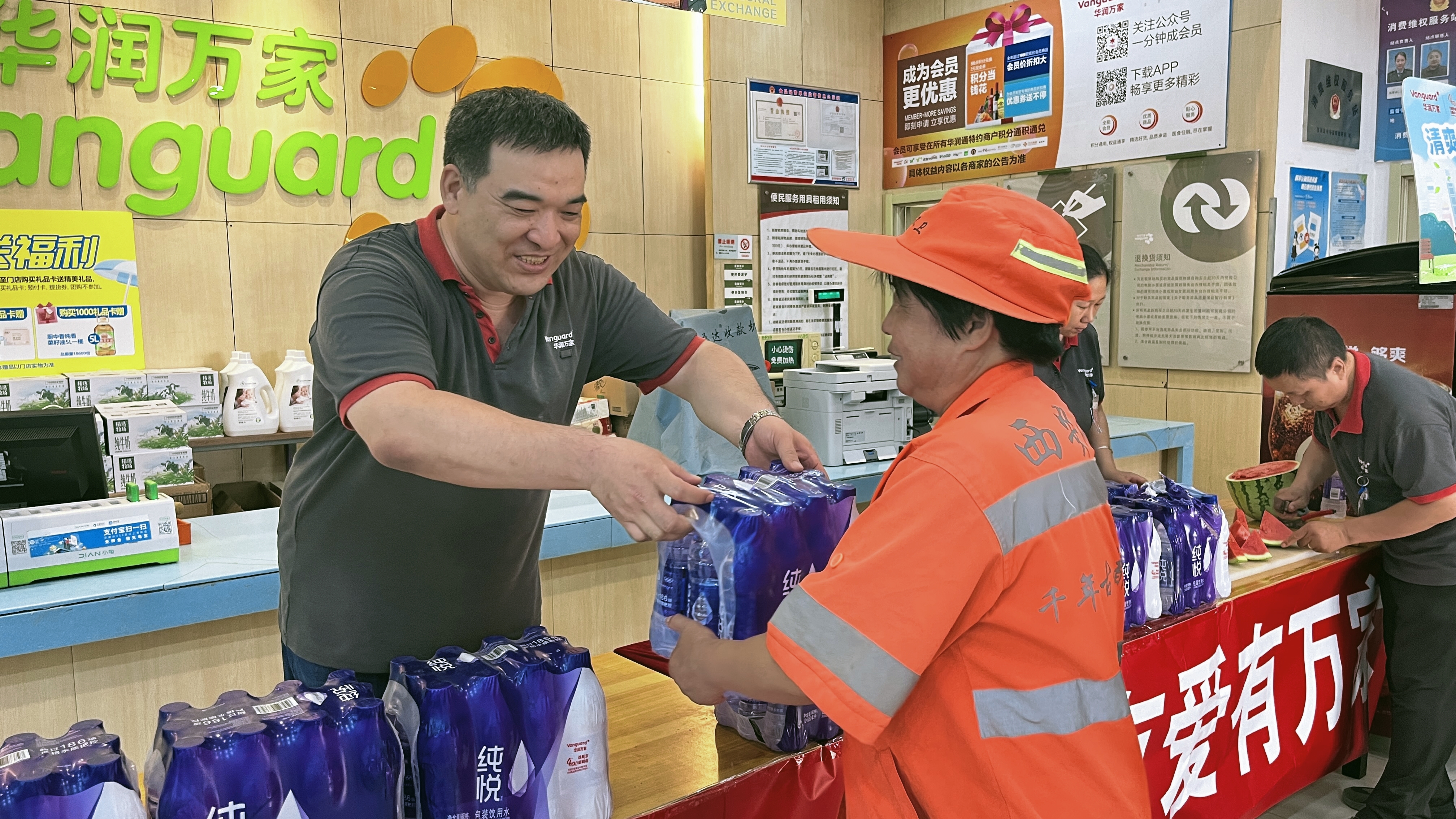7月15日至8月15日,华润万家在全国范围内开展主题为“清爽过一夏 有爱有万家”的夏日送清凉公益活动,面向从事高温作业的环卫工人、交警、快递员、建筑工人、消防员等群体,开展形式多样的关爱行动。活动覆盖近50个城市的400多家华润万家门店,送出20万瓶爱心纯净水。