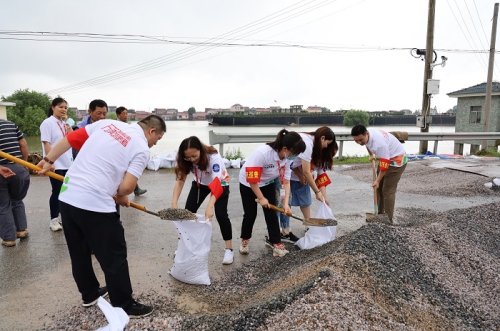 随后,一行人跟随阳江镇常务副镇长李全军的步伐,开始对水阳江胜利圩的大堤进行巡查,在巡查过程中,一排摆放整齐的防汛沙袋吸引了大家的注意,在苏果党员代表的号召下,大家加入了填装沙袋的队伍,尽管天空此时下起了小雨,但丝毫没有影响大家的填装热情和效率。李全军告诉记者,“我们真切的感受到了来自苏果的关心,让人备受感动,我相信有大家的关怀、有全体干部群众的坚守,我们一定能够战胜洪魔,安全度过汛期。”
