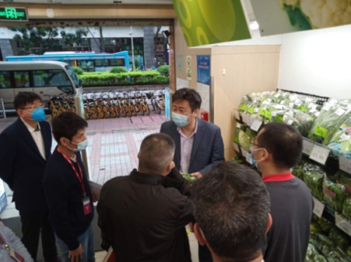3月31日,华润万家总经理徐辉、副总经理刘志文、纪委书记杨坤等一行到广州大卖场萝岗店、标超华景逸雅店、Olé太古汇店以及广州干货DC调研疫情防控及复工复产工作。