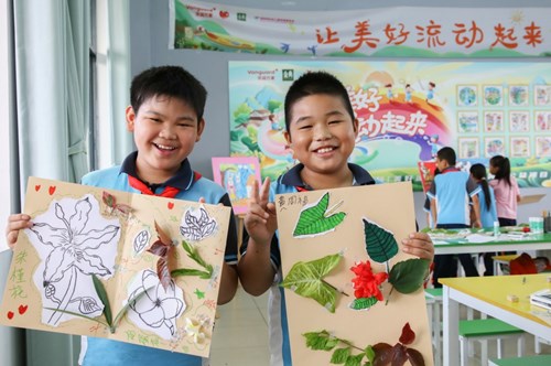 美术课程上,孩子们利用手中画笔,在万家美术老师的指导下,以广西的好山好水好风光为灵感,共创完成“我的家乡长卷画”;为培养孩子们爱自然、爱环境的意识,课程团队充分利用广西本地的环境资源,设计出植物日记课,让孩子们在亲近大自然、收集掉落的花朵和落叶的同时观察植物特性,学会用艺术的手法保留大自然的美好;此外,变废为宝的玻璃瓶绘画课,则引导学生在闲置的玻璃瓶上进行美术创作,让闲置材料变成精美的艺术品,在传递美术知识的同时也激发孩子们的环保、创新意识。